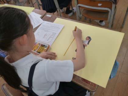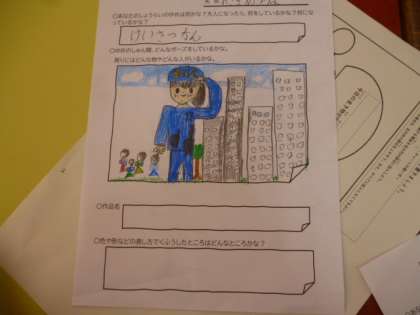 図画工作科であh「未来へタイムスリップ」という題材で将来の自分を描いています。科学者や警察官、パティシエにバスケットボール選手など、3年生の夢が広がって、見ていて心がほっこりしました。