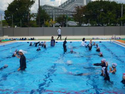 1年生も今日がプール納めでした。大きくて広いプールにドキドキしながらスタートした6月末。今ではプールの時間をワクワクして迎えています。「かえるにへんし〜ん」や「いるかもへんし〜ん」の水中ジャンプがとても上手になりました。浮いたりもぐったりもできるようになりましたね。1年生の成長に拍手です☆