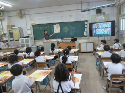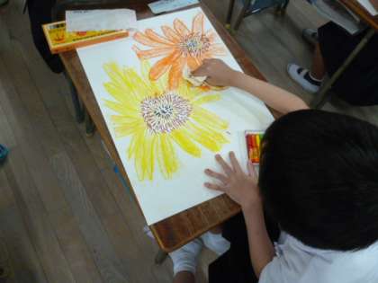 学習園のひまわりは、1学期の間にぐんぐん成長して、きれいな花を咲かせました。その様子を観察した1年生。花開いたひまわりを思い出し、絵に表しています。子どもたちの画用紙にも大きな大きなひまわりが咲きました〜☆