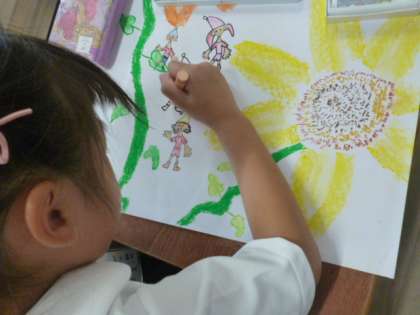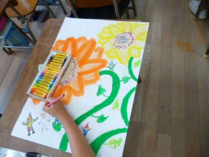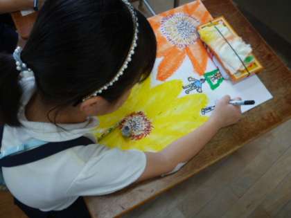 大きなひまわりの中に、かわいらしいこびとの姿が!!ひまわりと楽しそうに遊んでいる様子をのびのびと描いていました。