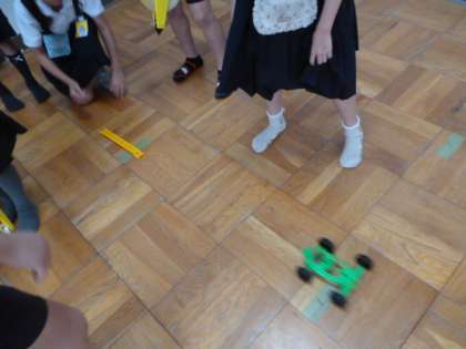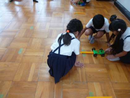 前回は風の力で車を動かしました。今回はゴムの力で車を動かします。風の力に比べてゴムの力はより遠くへ車が走りました。さらに遠くまで走らせるにはどうしたらよいか、考えながら実験しました♪