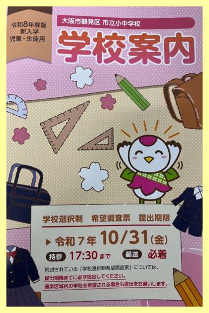 明日は、令和8年度入学児童の保護者さまを対象とした学校公開および学校説明会を行います。写真の冊子を持っていただきますよう、よろしくお願いいたします。