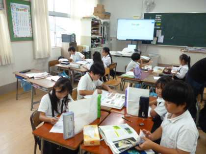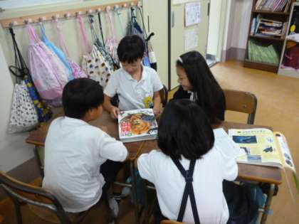 国語科では「動物カードを作ろう」を学習しています。さまざまな生き物の本を読み、カードに表したい動物を選んで紹介文を考えています。友だちと本を読み合うなど、協力して作る姿も見られました。
