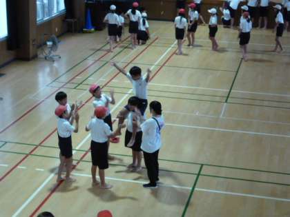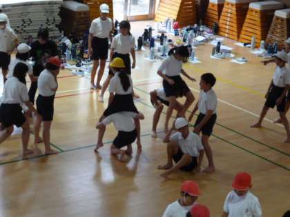 体育科では二人技「サボテン」に挑戦するために、肩車を練習しました。支える側も乗る側も互いの信頼関係と体幹が必要です。個人では体幹を鍛えつつ、信頼関係を築いてLet's Try!!頑張りましょう。