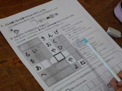 今回のテーマは「朝ごはんを食べよう」です。朝ごはんのはたらきとして3つのスイッチがONになることをおさらいし、その朝ごはんをおいしく食べるにはどうしたらよいかを考えました。朝ごはんにおすすめの食べ物が隠れたクロスワードパズルもあって、とても楽しく学習しました。