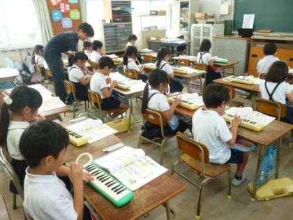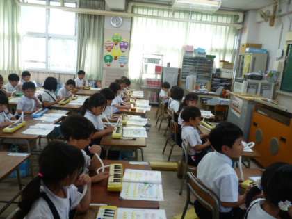 鍵盤ハーモニカがとても上手になっている1年生。ドレミファソまでは親指から子指で弾けますが、さて「ラ」はどう弾く???指を置き換えて演奏するのですが…とても難しい様子でした。