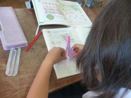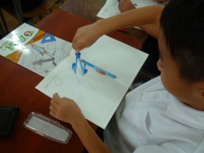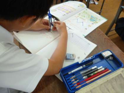 算数科では「円と球」の学習が始まりました。はじめて使うコンパスに興味津々の3年生です。コンパスは算数科では必須アイテムとなっていきますので、使い方をしっかりマスターしてほしいと思います。