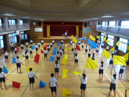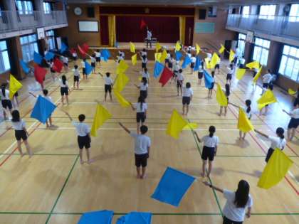 運動会で演技するフラッグ。バッサバッサと旗を振る威勢のいい音が講堂から聞こえてきました。講堂は狭いので、半分に分かれて交代しながら練習しています。待っている時も動作を覚える時間です。みなが集中して取り組んでいて、さすが6年生と感心しました。