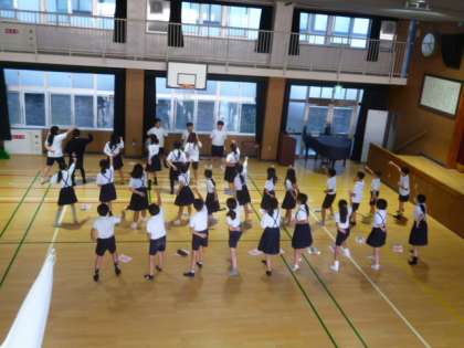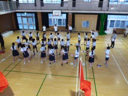 今年の応援団はリニューアル!!6年生がチームを組んで、三三七拍子のフリやエール交換の内容などを決めました。チームごとに前に出て、4・5年生に内容を伝えています。リーダーシップを発揮している6年生の姿は頼もしい限りです。