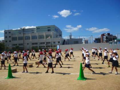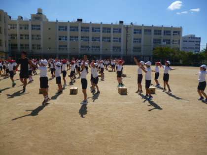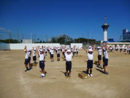 運動場で元気いっぱいに働きました!?2年生は「はたらく細胞」の曲でダンスします。ダンスというより…健康体操。思わず一緒に踊りたく…いやいや働きたくなりますよ♪