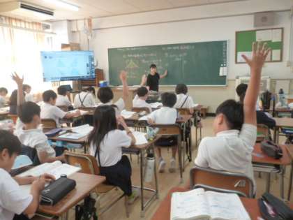 算数科では「図形の面積」を学習しています。三角形の面積の求めるにあたって、三角形のどの辺が底辺で底辺に対してどの部分が高さになるかを考えました。ここを見極めることで間違えなく答えが求められることが分かりました。