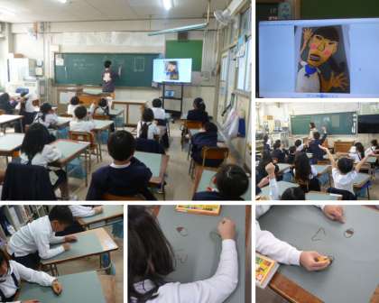 図画工作科では、運動会の絵として踊っている自分を描きます。動きを出すために、まずは顔の中心「鼻」から描いていきます。「握りこぶしくらいの大きさで…」と先生から指示があったのですが…とても小さくてかわいい鼻を描いている子もいました。顔のパーツごとに丁寧に描いている1年生です!