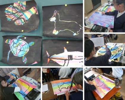 4年 とっても鮮やかです(11/28) 公開日 2025/11/28 更新日 2025/11/28 4年 鮮やかな色で塗られた画用紙はこの後どうなるのかな…?と4年生の教室の前を通るたびに思っていました。なるほど…このようになるのですね♪生き物は墨を使って描き、生き物の周りの黒色も墨で塗っていました。 いいね(0)