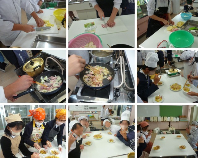 今日は2クラスが調理実習を行いました。献立は「ジャーマンポテト」です。じゃがいもをゆでる、たまねぎやベーコン、ゆでたじゃがいも炒める…味付けをするという調理手順に沿ってグループで協力して作りました。じゃがいもが固いかな?と感じましたが、自分たちで作った料理はおいしいものです。家庭科の学習は、家庭で実践することも学習の一つです。ぜひ、家族のために実践してほしいと思います♪