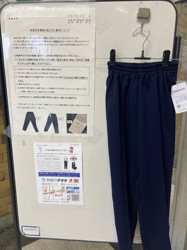 本日より18日(木)まで、学期末個人懇談会を行います。保護者のみなさまには、お忙しいなか、ご来校いただきありがとうございます。懇談の際も「来校者証」を携帯していただきますよう、ご協力をお願いいたします。また、玄関前に「落とし物」と「体操長ズボンの見本」を置いておりますので、ご来校の際にご覧いただきますよう、よろしくお願いいたします。