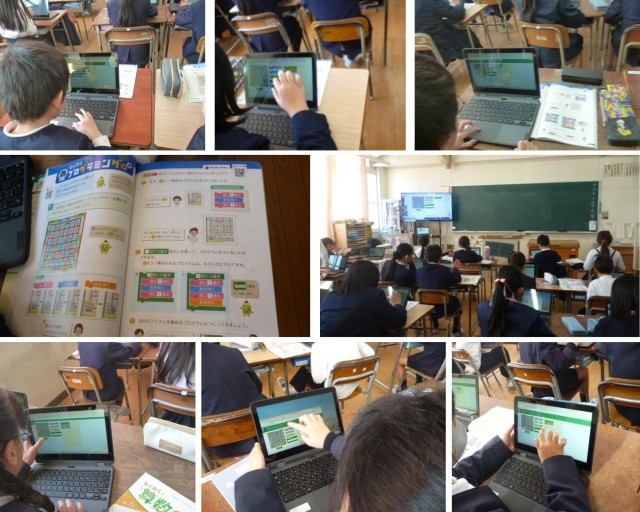 算数科では「プログラミング」をしました。今日はICT支援員さんの来校日でもあったので、サポートしてもらいながら頑張りました。こちらが思っているより、子どもたちはプログラミングについてよく知っていて、サクサクと取り組んでいました。素晴らしいです♪