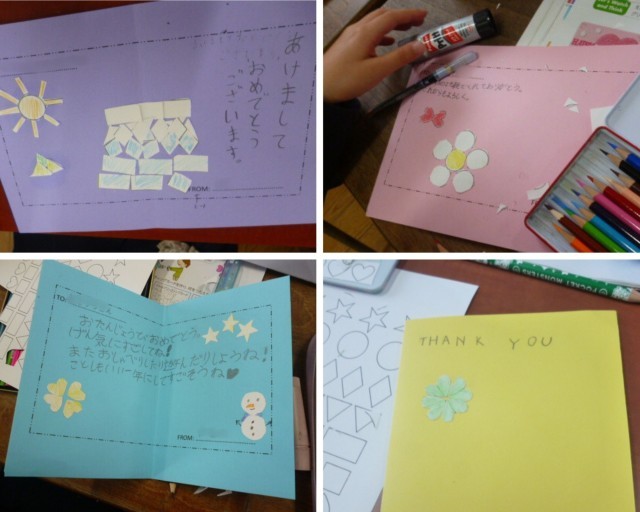 外国語活動では、図形の学習をし、それを使ってグリーティングカードを制作しました。NEW YEARカード、BIRTHDAYカード、THANK YOUカードから、作りたいカードを選びました。今回はカードの内容よりも、図形をいかに使って仕上げていくかをメインにして取り組みました。4クラスとも発想が豊かで、驚きと感心の連続でした!もっと時間があればもっと素敵なカードができそうでしたが、短い時間で出来栄えの見事なカードが完成しました。「This is for you.」と言ってから渡すことがこの学習の醍醐味ですが…ちゃんと渡せたかな?
