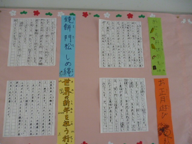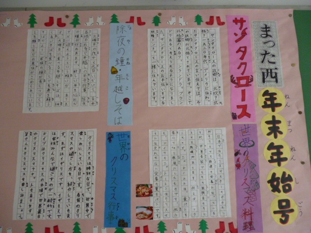 校長室横の掲示板には、新聞委員会制作の「まった西新聞」が掲示されていまうs。年末年始号として、クリスマスや大みそか、お正月にまつわる記事が載っています。なるほど・・・と記事を読んで初めて知ることがありました。お正月遊びの「すごろく」には1年の運だめし、「羽根つき」には1年の厄をはねのけるという意味があるそうです。羽根つきしようかな?!と思ってしまいました♪学校のあちらこちらの掲示板が、新年を迎える掲示になっています。少しずつ紹介していきたいと思います!