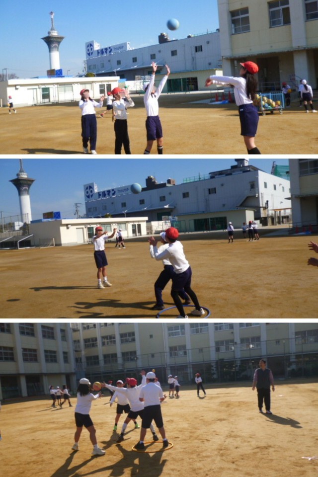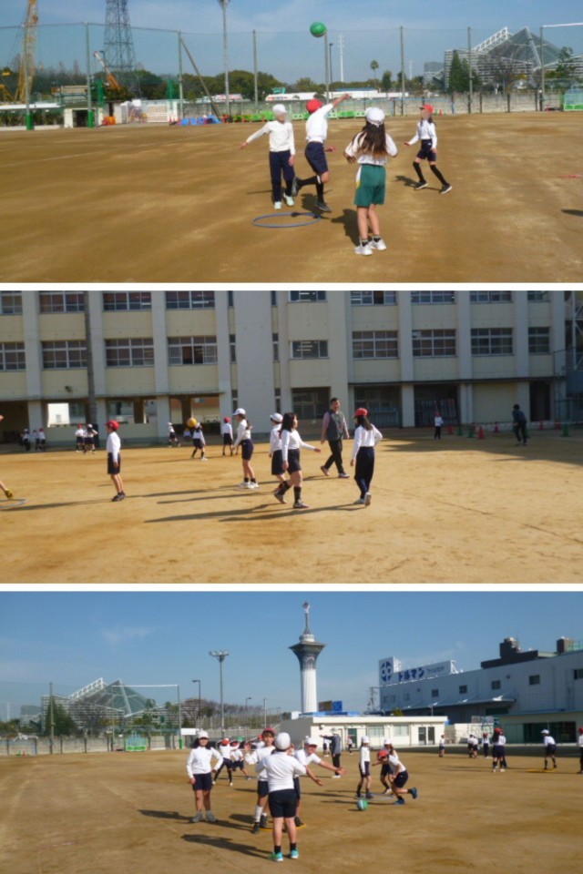 運動場の整地がほぼほぼ終わり、広くなった運動場1番乗りで4年生が体育科の学習をしました。「ポートボールゲーム」を行うための練習です。ガードマンにボールを取られないように、ゴールマンに向かってシュート!を繰り返し練習していました。今日は日射しがたっぷりで暖かく、運動場での体育日和でしたね。