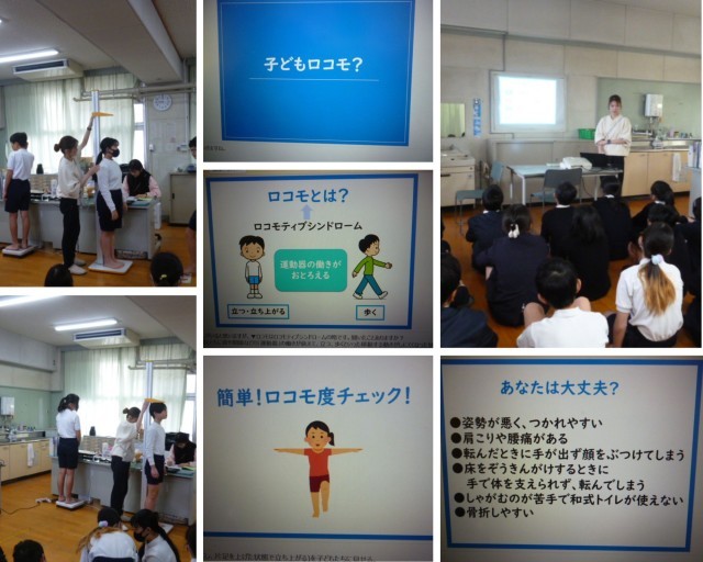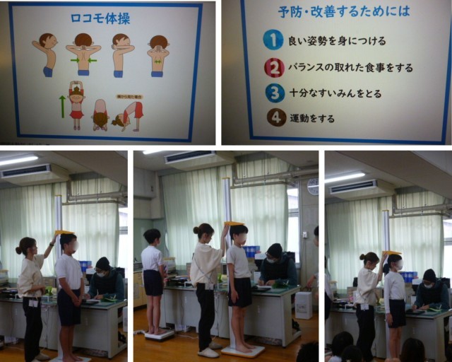小学校生活最後の発育測定と保健指導がありました。自分の成長に関心を持ち、特に身長の伸び具合を気にしていました。体の成長には「個人差」がありますし、これからが成長期ですので、楽しみにしてほしいと思います。保健指導は「こどもロコモ?」でした。運動不足や生活習慣の偏りにより、骨・関節・筋肉などの運動器が低下し、転びやすい、体が硬い、バランスが悪いなどの状態になることを「こどもロコモ」といいます。「簡単ロコモ度チェック」をして、自分の体の状態を知りました。「ロコモ体操」も教えてもらいました。肩甲骨や股関節を伸ばし、正しい姿勢で過ごすことで予防ができるそうです。体の成長とともに運動機能も高まる時期です。正しい生活習慣や正しい姿勢を意識して、「こどもロコモ」にならないように気をつけましょう。