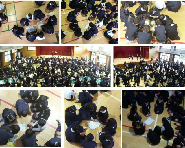 今日は「曲あてクイズ」をしました。集会委員会が曲の歌詞を読んで伝え、たてわり班で相談してその曲が何かを当てます。聴き馴染みのある曲を選曲してクイズにしていたおかげで、全問正解が続出でした。寒波の到来で寒い朝でしたが、たてわり班で集まって温かい気持ちになりました。