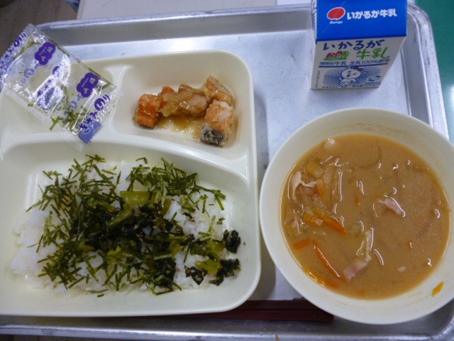 今日の給食は、学校給食コンクール優秀賞献立でした☆こまつなっ葉めしは、ごはんとの相性抜群で、混ぜて食べるとあっという間に完食!さけの和風マリネソースかけは酸味がほどよく、あっさりしていました。寒い日にはやっぱりみそ汁!ベーコンが入っていたのは斬新でしたね。おいしい給食に体が温まりました♪