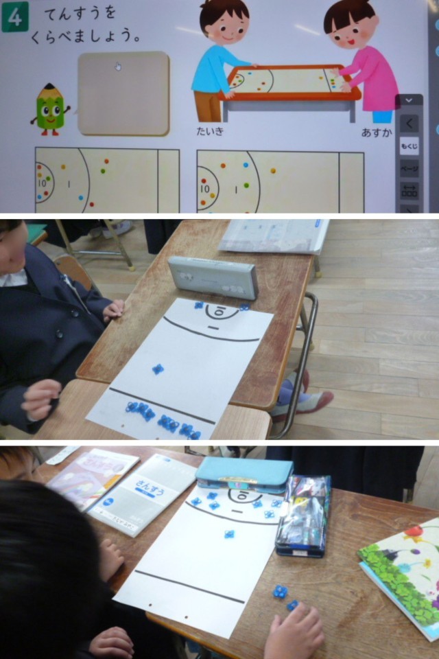算数科では「100までの数」を学習しています。この日は、10個のおはじきをはじいてその合計が何点になるかを計算し、友だちとくらべっこをしました。10点の円に向けてとても上手におはじきをはじいていて、高得点が続出!!10がいくつで1がいくつで…という2けたの数の概念を、ゲーム感覚でつかむことができました。