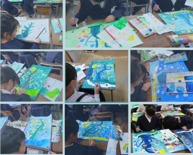 3年 モチモチの木に灯りが!(1/27) 公開日 2026/01/27 更新日 2026/01/27 3年 2学期に国語科で「モチモチの木」を学習しました。そして図画工作科では、モチモチの木に灯がともった様子を描いています。大きな木の幹と長く伸びた木の枝がお話の世界をしっかりと表しています。その枝にともった灯を優しく描いていました。集中してとても丁寧に描いています♪ いいね(1)