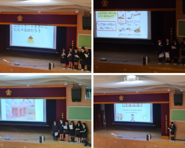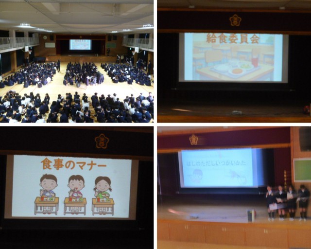給食週間真っ只中ということで、今日は給食委員会による発表で、食事のマナーやはしの持ち方、食事のあいさつなど、スライドを用いて説明しました。分かりやすい説明で、全校のみんなが集中して聞いていました。給食週間を活気づけるとても良い発表でした。給食委員会のみなさん、どうもありがとう。