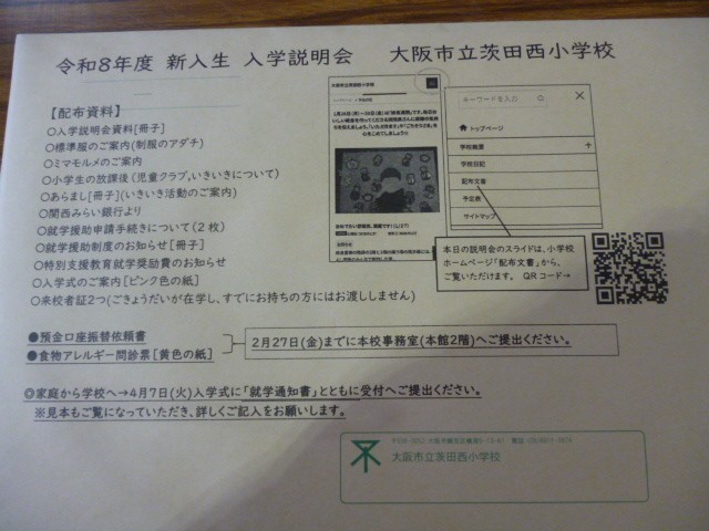令和8年度入学児童の保護者様を対象とした「入学説明会」を行いました。お忙しい中、またみぞれが降る中お越しいただき、ありがとうございました。本日お渡しした資料を読んでいただき、提出物は2月27日(金)までに本校事務室までご提出をお願いいたします。説明会で使用したスライドは、このホームページからもご覧いただけますのでご活用ください。なお、本日お越しいただけなかった保護者様は、資料の配布と算数セットの購入を職員室で承りますので、できるだけ早めにご来校ください。4月7日(火)、お子さまの入学を楽しみにお待ちしております。