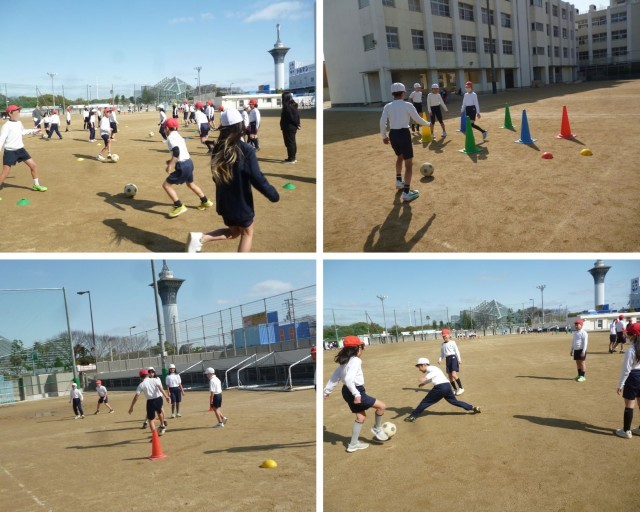 体育科ではサッカーに取り組みます。運動場が広くなり、のびのびとボールけりができます。ドリブルの練習をしたり、パス回しの練習をしたりと息が切れるほど運動しました。チームで練習内容を考えて取り組む姿に、高学年らしさが見え頼もしく感じました。