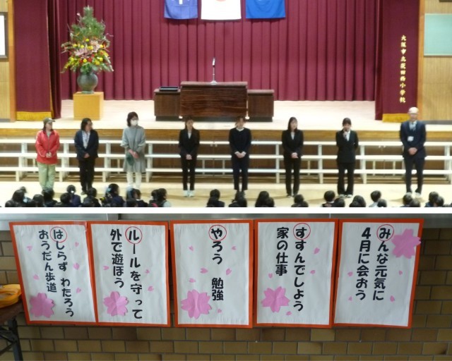 令和7年度の修了式を行いました。現在の学年が修了したことを示す「修了証」の授与は、5年生が代表して校長先生からいただきました。その姿に、今年度が終わるんだな…と改めて実感しました。この1年間、よく頑張った子どもたちです。校長先生からは、4月の自分を思い起こし、心身ともに大きく成長したことを実感してほしいというお話がありました。生活指導の先生からは、「はるやすみ」の文字にちなんだ、5つの気をつけてほしいことを伝えました。どんな内容かは写真をご覧ください!修了式を終え、今年度で茨田西小学校を去る教職員の方からのお別れの挨拶がありました。さみしい思いもありますが、別れがあれば出会いもある春です。次、こうして講堂に集まるときは、一つ学年が上がり、新しい出会いに胸をときめかしていることでしょう。良いスタートを切るためにも、春休みを充実した日々にしてほしいと思います。この1年間、本当によく頑張りました。ご家庭でもその頑張りをたくさんほめていただきたいと思います。