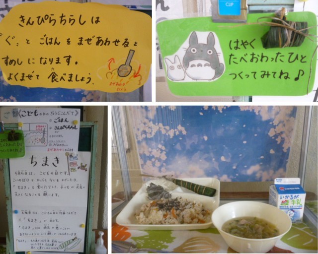 給食では、一足お先に「こどもの日」の気分になりました。きんぷらちらしに五目汁、ちまきが登場!「ちまき」には、病気や悪いことが起きないように…という願いが込められています。気温差によるものか、疲れによるものか、発熱や咳症状での欠席者が増えています。元気に4月を終え、ゴールデンウィークを迎えられるように、ご家庭でも健康管理をお願いいたします。