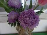 今月のお花の写真です。チューリップのピンク色もきれいですが、アスターの紫色が目に...
