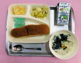 今日の給食は「おさつパン、わかさぎフライ、白菜のスープ、カリフラワーのサラダ、牛...