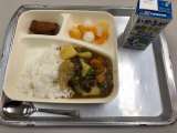 今日は入学お祝い献立「カツカレーライス・フルーツ白玉・牛乳」です。 1年生のみな...