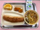 今日の献立は、「カレースープスパゲッティ・焼きかぼちゃ・あまなつかん・おさつパン...