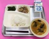 今日の給食は「ごはん、豚肉とじゃがいもの煮物、オクラの梅風味、ツナっ葉いため、牛...