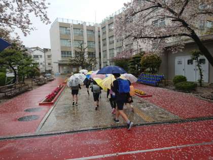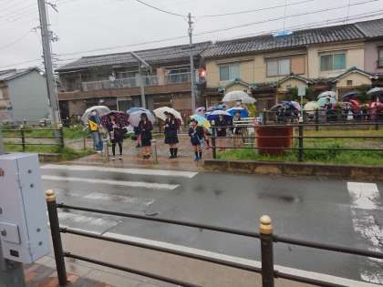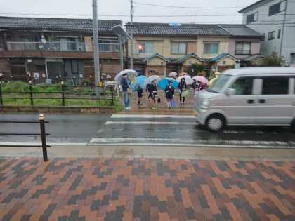 本校の正門前には交通量の多い道路がありますが、雨の中でも児童たちは交通ルールを守って登校しています。
