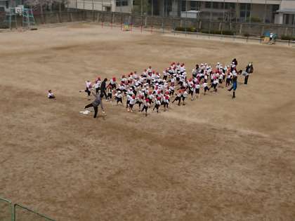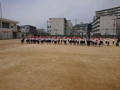 1ねんせいは、全員でグランドに出てバランス体操をしました。