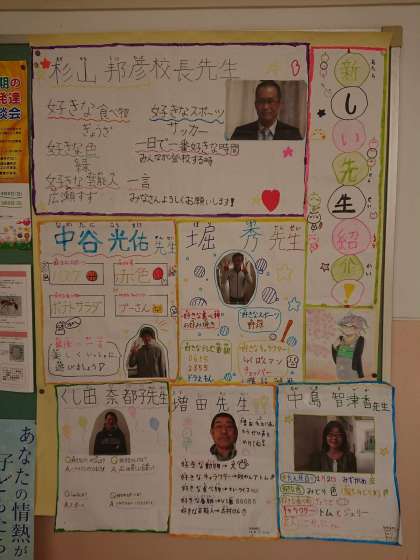 新聞委員が作成した「新しい先生紹介」が職員室前に掲示しています。