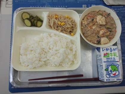 今日の給食は、マーボーどうふ、きゅうりの甘酢づけ、もやしとコーンのごまいためです。
