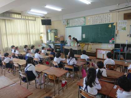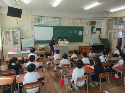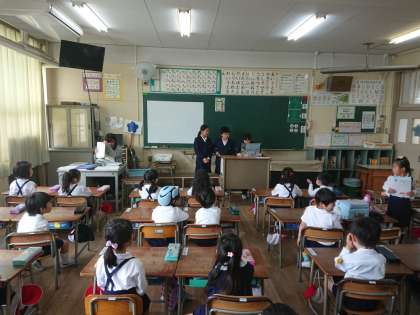 1年生の読書タイムでは、図書委員のお兄さん、お姉さんが紙芝居を読んでくれます。