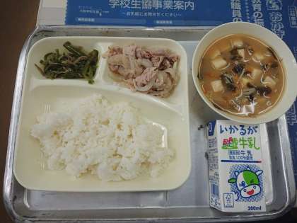 今日の給食は、豚肉のおろしじょうゆかけ、みそ汁、じゃこピーマンです。