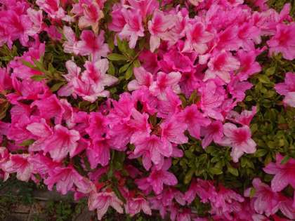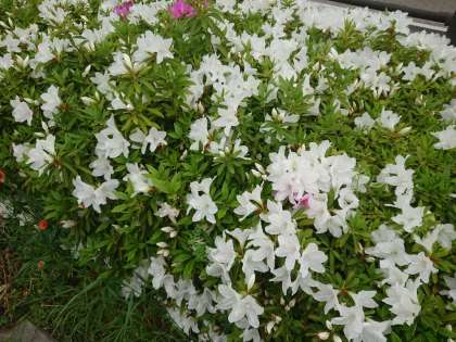 学校前の歩行者通路は赤や白のツツジが満開です。