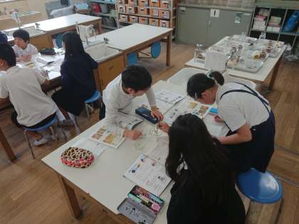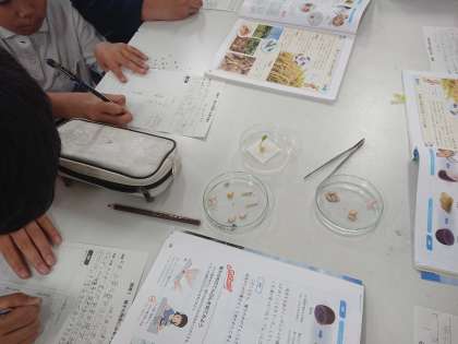 発芽に必要な養分がどこにあるのかを、ヨウ素液を使って調べています。