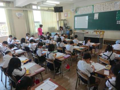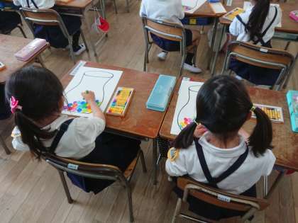 ビンの中の玉をクレヨンで色ぬりをしています。
