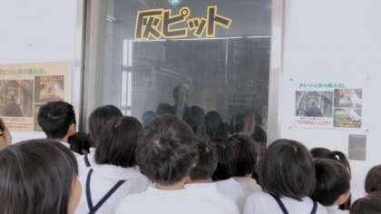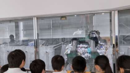 工場内を見学し、ゴミピットで運んできたゴミを焼却炉へと入れるところを見せてもらいました。