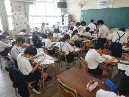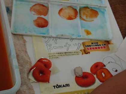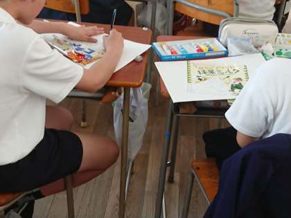 6年生の図工では、お菓子の袋の一部を切り取り、その切り取った部分をスケッチしています。