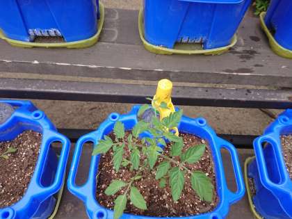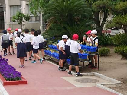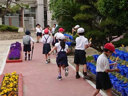 2年生は登校すると、玄関前にあるプチトマトに水をあげます。